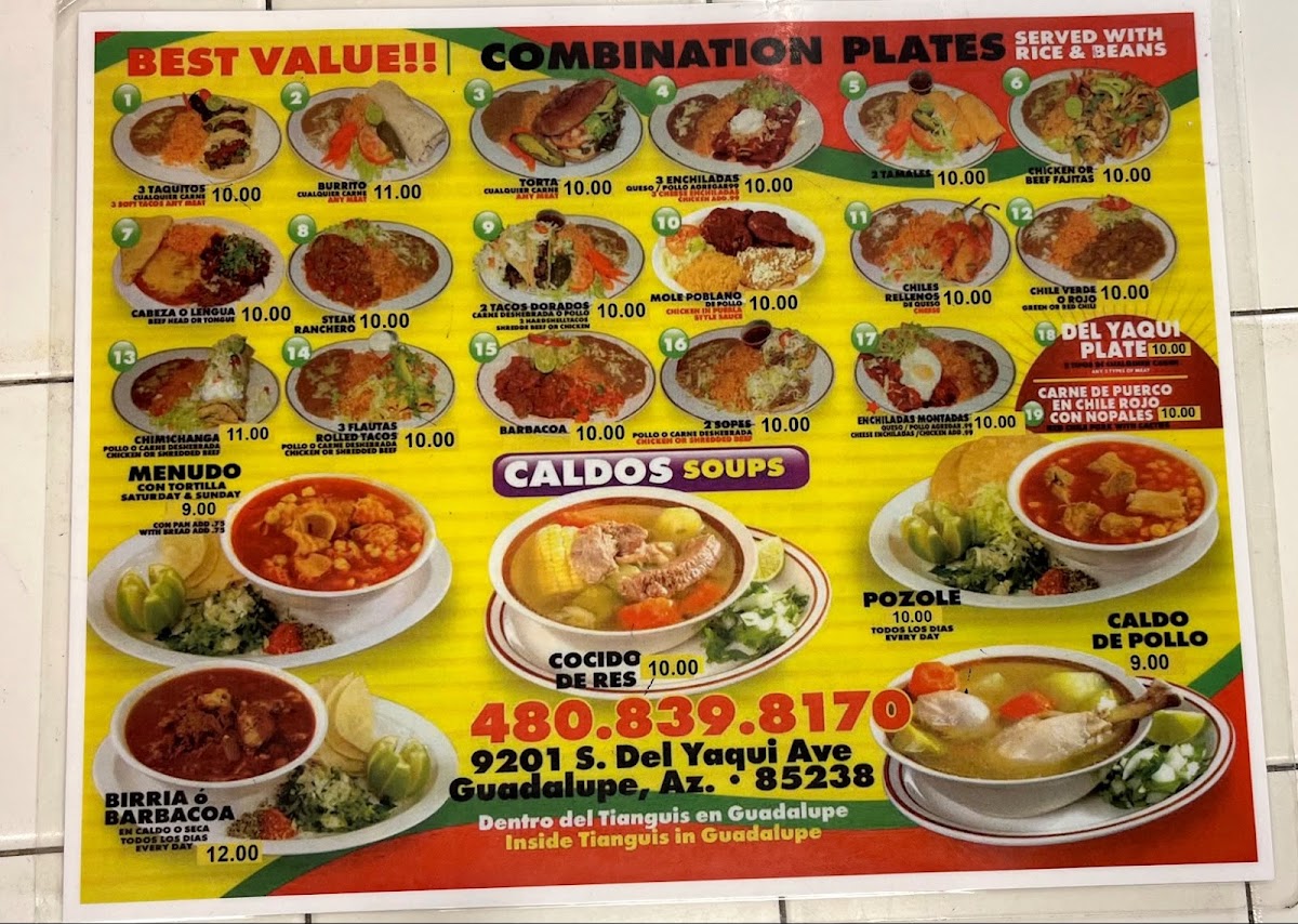“ Del Yaqui is a perfect family restaurant set in the city of Guadalupe inside the Yaqui community. Great food, genuinely kind people, in a nice, clean, sit-down family setting. All this at a reasonable price. And, they are open later than most other Mexican restaurants on Sunday evening. Recently, a friend told me of his experience at Del Yaqui, so I went on his recommendation. I was not disappointed. I ordered the chile verde plate, which came with rice and beans and two tortillas. The pork was perfectly tender, the green sauce was delicious, and the dinner was served hot. My friend ordered a meal with two tacos and the rice and beans as well. Finally, we also split a full bowl of the Caldo de Pollo (chicken soup), which came with its own tortillas as well. The soup was phenomenal. I absolutely love good soup, and this was a joy to eat. All the food came in good portions as well. The staff was very kind and explained the entrees, as well as making sure to accurately take our orders. Even though this is a counter-order restaurant, they still served the food to the table and graciously helped us when we had requests. The prices likewise were reasonable. Most meals were right at 11 each. If you are near the town of Guadalupe, do yourself a favor and try this little gem, Del Yaqui! You won't be disappointed! ”
